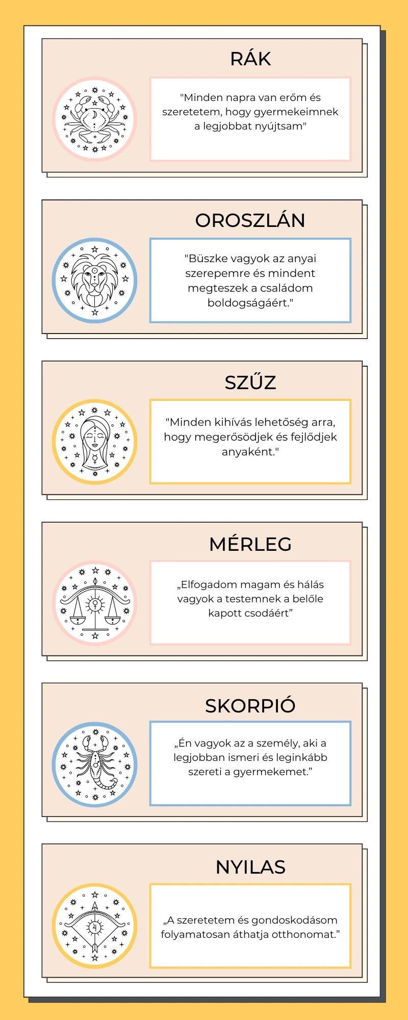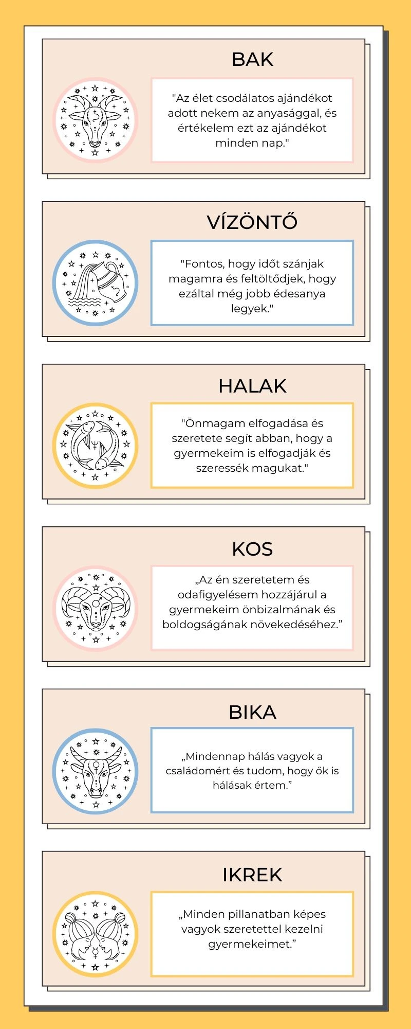 Olvasd el a legfőbb csillagjegyek alapján összeállított Anya-mantra listánkat, ismételd el magadnak a tiédet hangosan háromszor, írd ki egy cetlire és vidd magaddal a munkahelyedre, hogy bármikor rápillanthass, ha szükséged van rá; vagy akár írd fel a tükörre, ha úgy látod, azzal könnyebben magadénak érezheted a leírt sorokat!