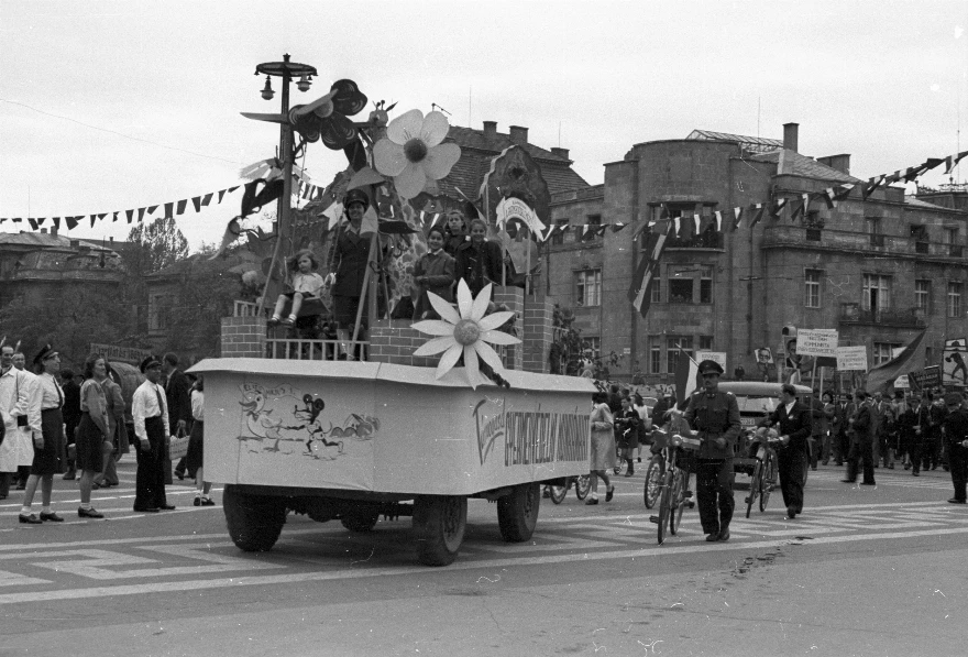 A május 1-jei felvonulásokhoz a feldíszített teherautók is hozzátartoztak. (Fotó: Fortepan, Berkó Pál, 1947)