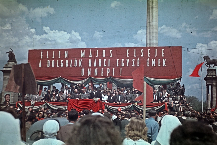 A felvonulást minden év május 1-jén megismételték, egészen a rendszerváltásig. Az 1946-os felvonulást dísztribünönről szemlélte Rákosi Mátyás (középen), Szakasits Árpád és Veres Péter. (Fotó: Fortepan, Aszódi Zoltán 1946)