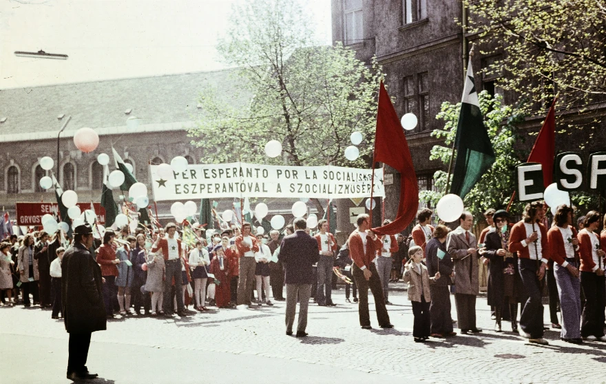 A résztvevők rendszerint a termelés növelésére buzdító, valamint a 3 és az 5 éves tervet dicsőítő táblákat emeltek a magasba. De olyan felirat is akadt, amivel az eszperantó nyelvtanulást igyekeztek népszerűsíteni. (Fotó: Fortepan, Tildi Istvánné, 1976)
