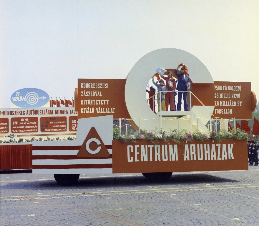 A Centrum Áruház és a Volán is képviseltette magát a mai Ötvenhatosok terén, korábbi nevén a Felvonulási téren. (Fotó: Fortepan, Főfotó)
