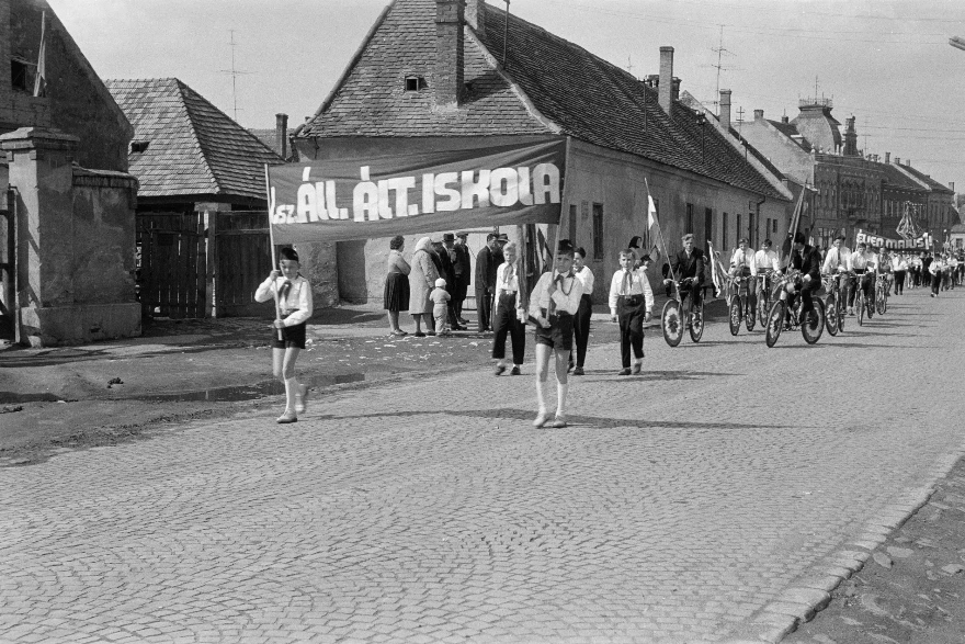 Természetesen, vidéken is megtartották a május 1-jei felvonulásokat. Csornán, a Soproni úton masíroztak végig az úttörők, a háttérben távolabb a Szent István (Szabadság) tér melletti épületek láthatók (Fotó: Fortepan, Lipovits Károly, 1964)