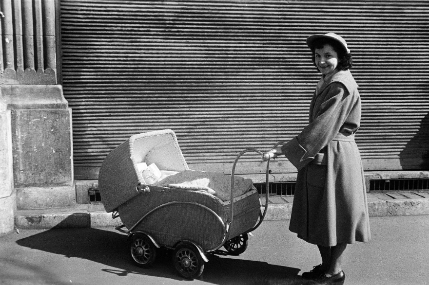 Dizájnos, korabeli babakocsi - a baba láthatóan élvezi a keleti kényelmet. (Fotó: Fortepan/Hámori Gyula, 1954)