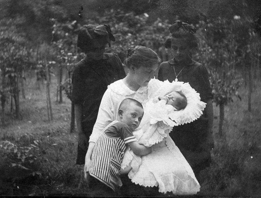 A fiatal anyukát 3 gyermekével együtt egy erdélyi ház udvarán örökítették meg 1906-ban. (Fotó: Fortepan/Cholnoky Tamás)
