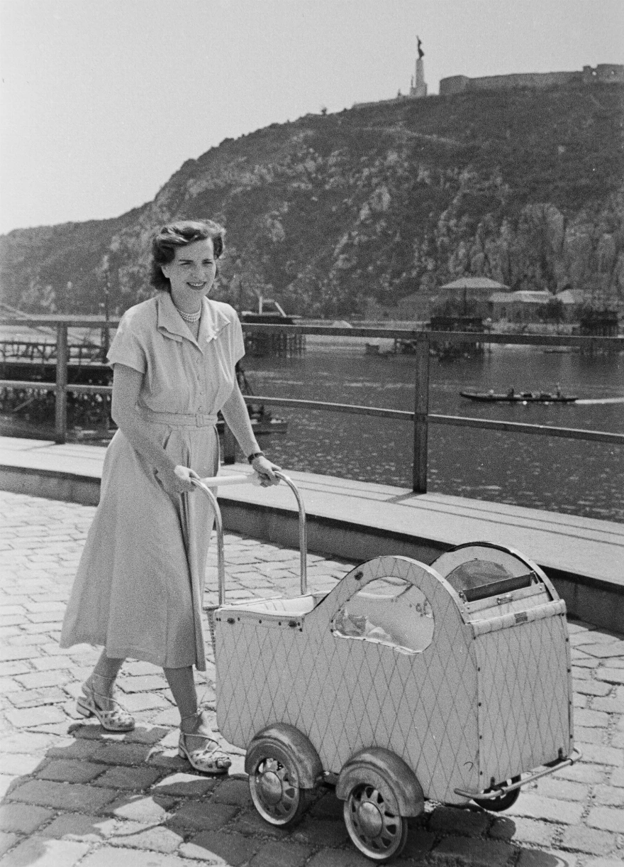 Nyári babás séta 1949-ben a pesti alsó rakparton, háttérben a lerombolt Erzsébet híd és a Gellért-hegy. (Fotó: Fortepan/ Kovács Márton Ernő)