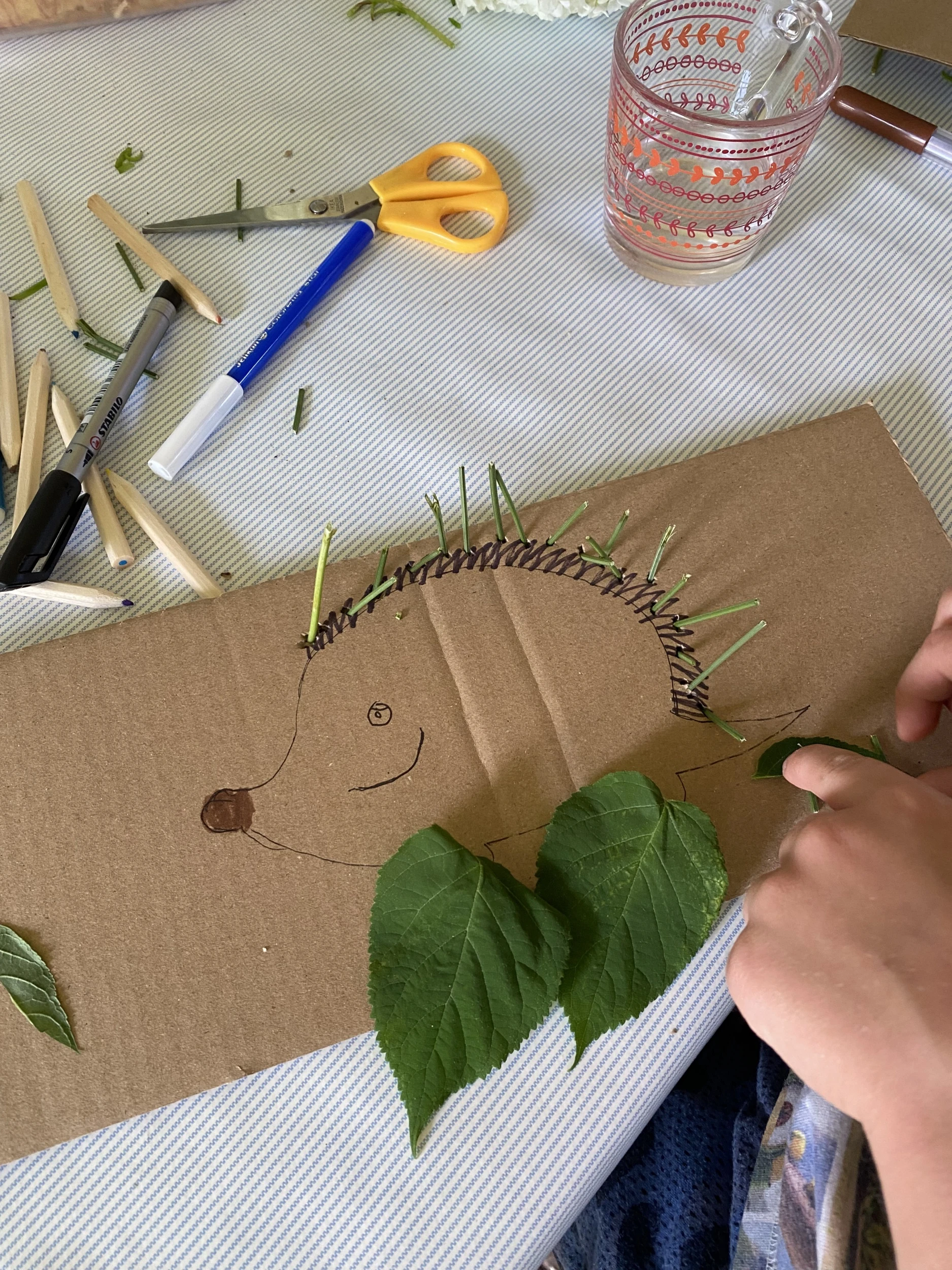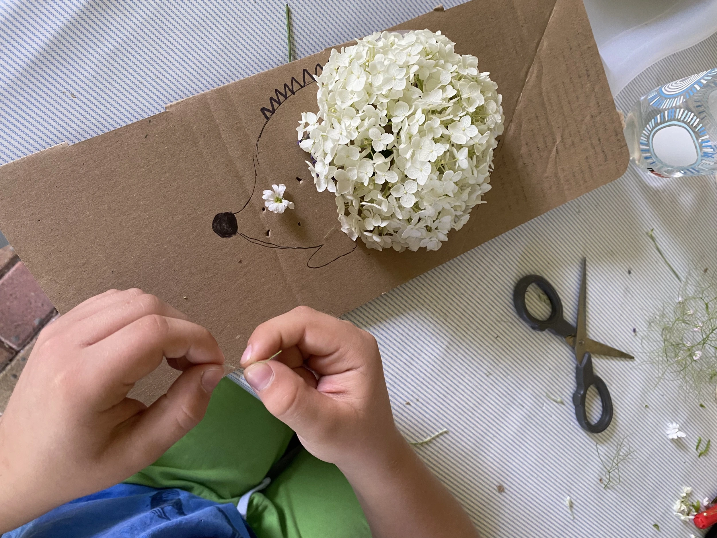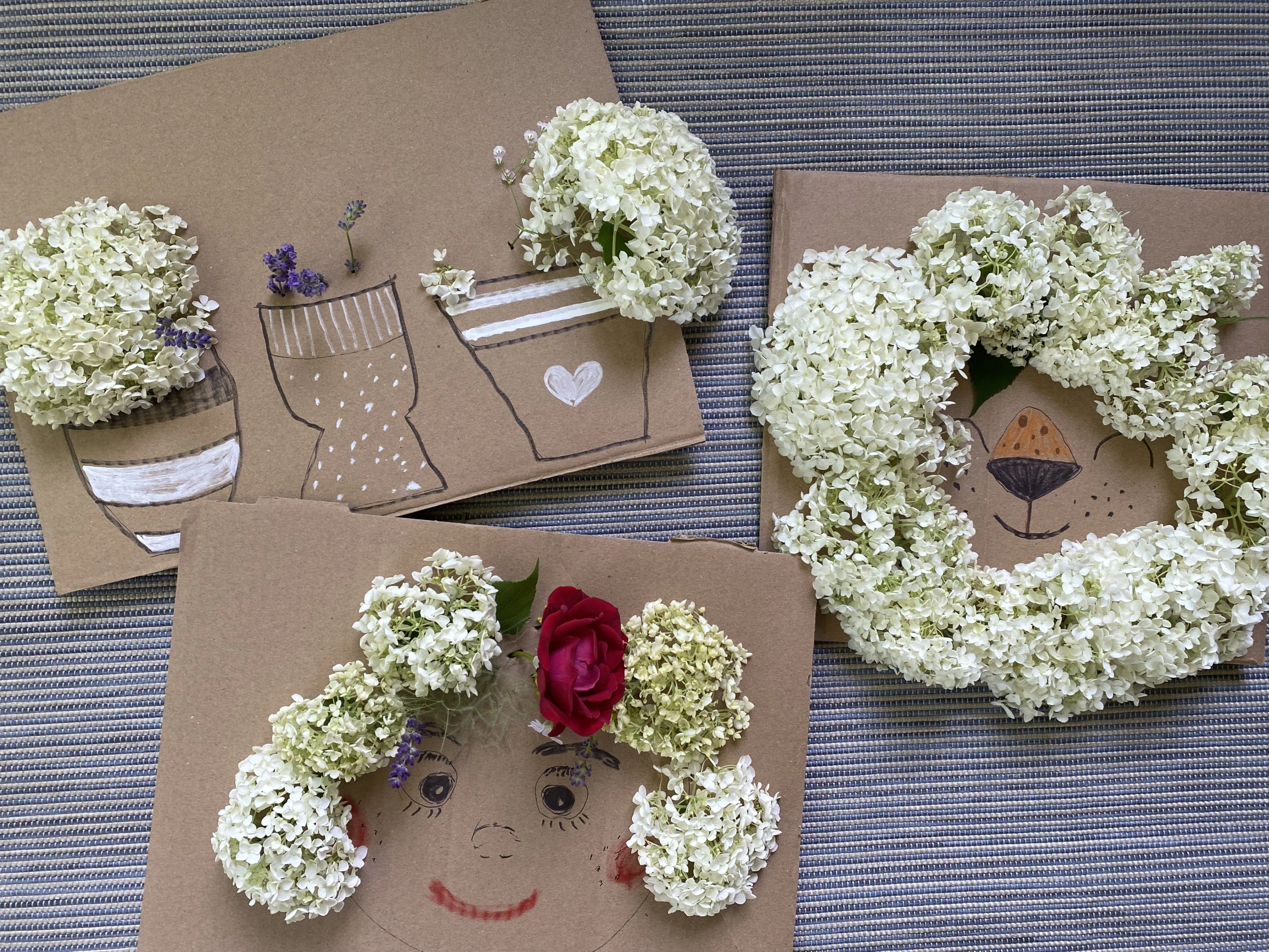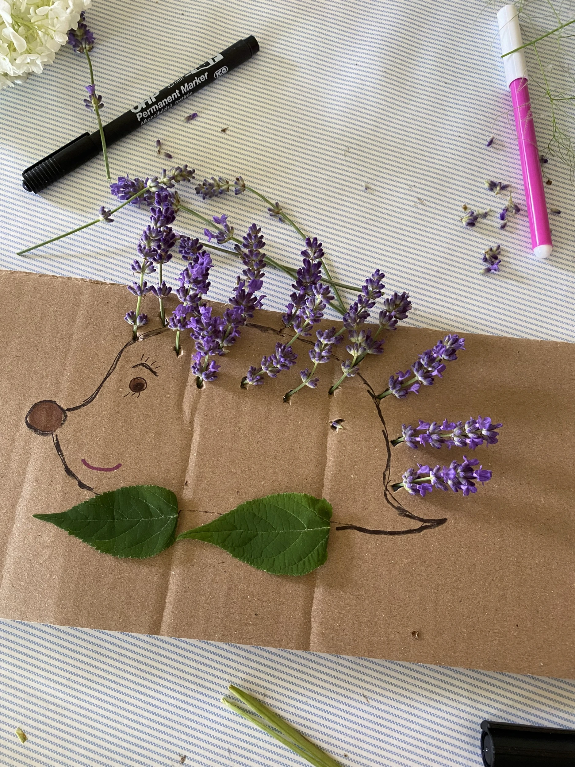 Én most a kertünkből szedtem idénynövényeket a projekthez: hortenziát, levendulát, rózsát, valamint apró sziklakerti növényeket, és két szomszéd fiú, Ádám és Dávid voltak a segítségemre abban, hogy minél változatosabb művek készülhessenek. A képeket nézegetve látni fogjátok, hogy a rajzoknak csak a fantázia szabhat határt, aki pedig magától nem tud figurákat rajzolni, azoknak ajánlom a Pinterestet, ahonnan számtalan sablont le lehet másolni.