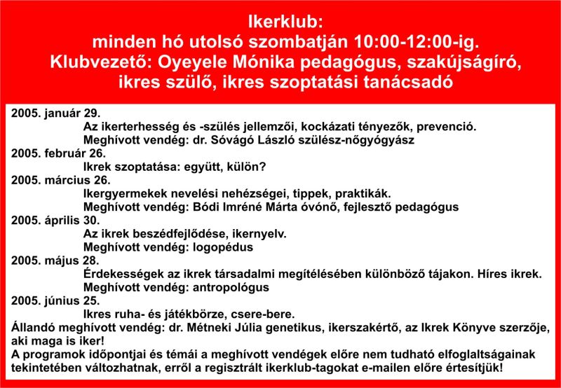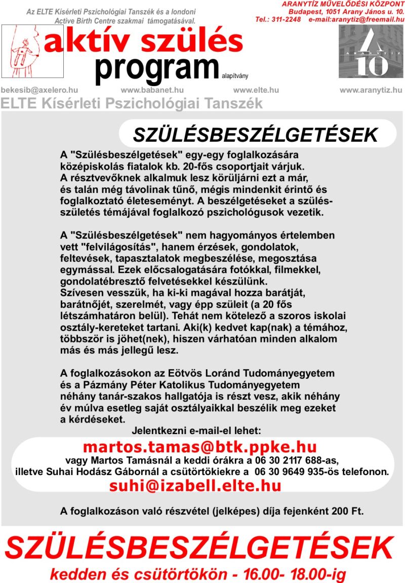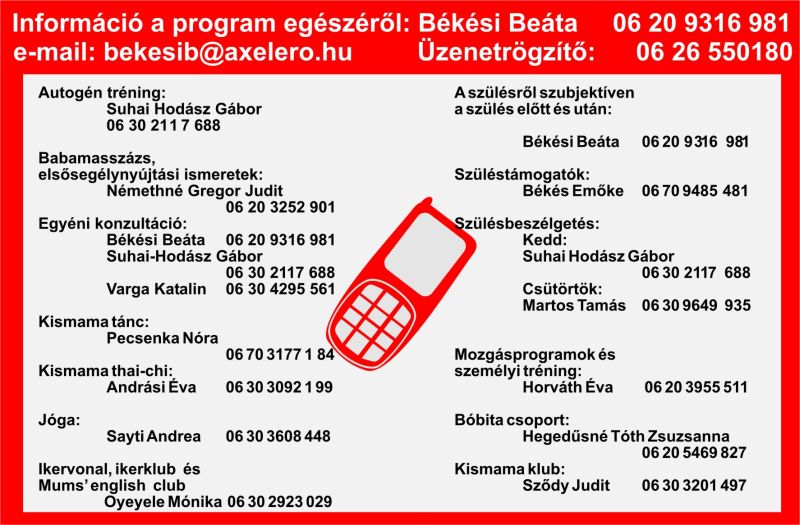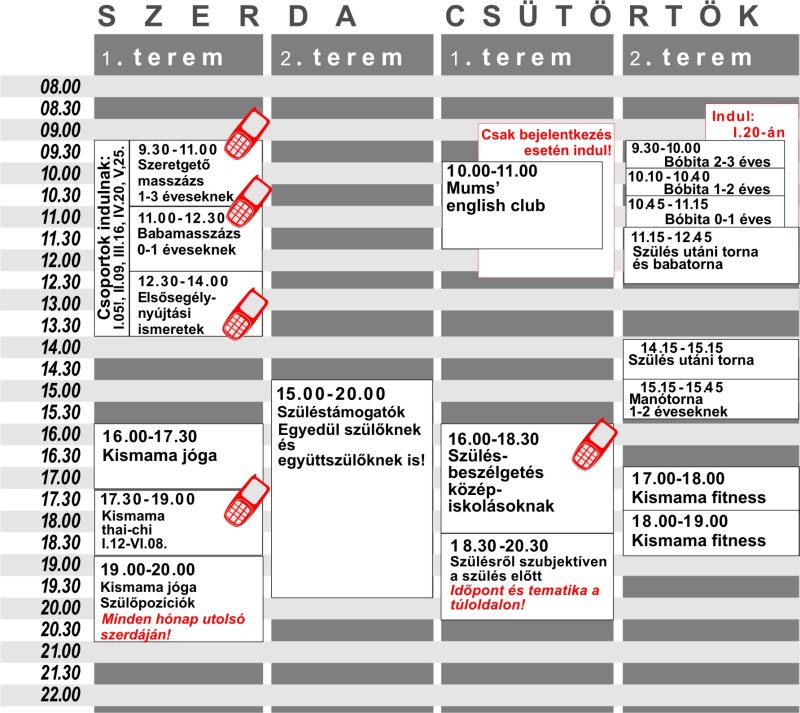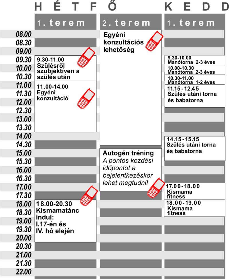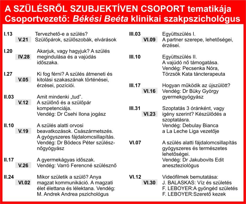 Részletes menetrend (hétfõ, kedd) Részletes menetrend (szerda, csütörtök) Részletes menetrend (péntek, szombat) A szülésrõl szubjektíven csoport tematikája Szülésbeszélgetések Ikerklub Újdonságok A program munkatársainak elérhetõsége A program díjai