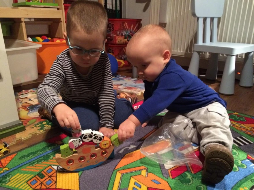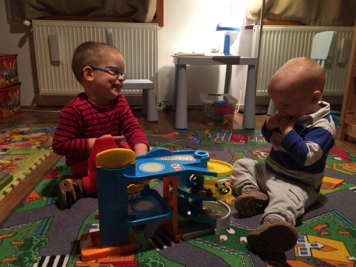 Mindenesetre érdekes látni ezeket a szituációkat és a magam részéről nagy felelősségnek tartom, hogyan adjuk a gyerekek tudtára, hogy ez bizony nem így van. Nálunk nagy civódások (még) nincsenek, sokszor csak ülök és figyelem egyik-másik reakcióját és csak a legvégén lépek közbe. Általában hagyom, hogy ők oldják meg a helyzetet egymás között, és csak akkor szólok bele, ha mondjuk, valamelyik feltekeri a hangerőt vagy elkezd durvulni. Ez szerencsére elég ritka eset. Alapjában véve, szerintem nagyon klassz természetű mindkét cseppem. És mivel kicsi a korkülönbség közöttük, már egyre több alkalommal észrevesszük, hogy kialakul az „együttjáték”. Volt már rá példa, hogy Marci mesélt öccsének a mesekönyvből, vagy épp Ádám adogatta a legokockákat bátyja újabb épülő tornyához. Nyilván köszönhető ez annak is, hogy Ádám is okosabb már, mutogat, kommunikál, helyesel (bólogat), tagad („mem!), és ez Marcinak is jobban tetszik, hogy megértik egymást.