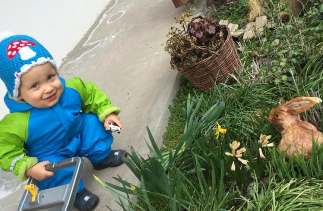 Azt a szuperanya képességemet pár hete már bevetettem, amelyet karácsonykor mutattam be a gyerekeknek, mikor a Mikulással és a Jézuskával „beszéltem”… Most épp a húsvéti nyuszi van soron, ő leselkedik és figyeli, ki hogy viselkedik, ki érdemel ajándékot, csokitojást. Van egy elég élethű nyuszi figuránk, amit egyik reggel kiraktam a kertbe, a szép tavaszi virágaim közé. Oviba jövet-menet jól megvizsgáljuk, megállapítjuk, hogy még mindig itt van, és tényleg szemmel tart minket. Lehet, hogy nem szép dolog, amit csinálok, de ez tökjól működött karácsonykor is, így most is alkalmazom ezt a módszert. (Csak azt nem tudom, ki vagy mi fog lesben állni nyáron és ősszel…)