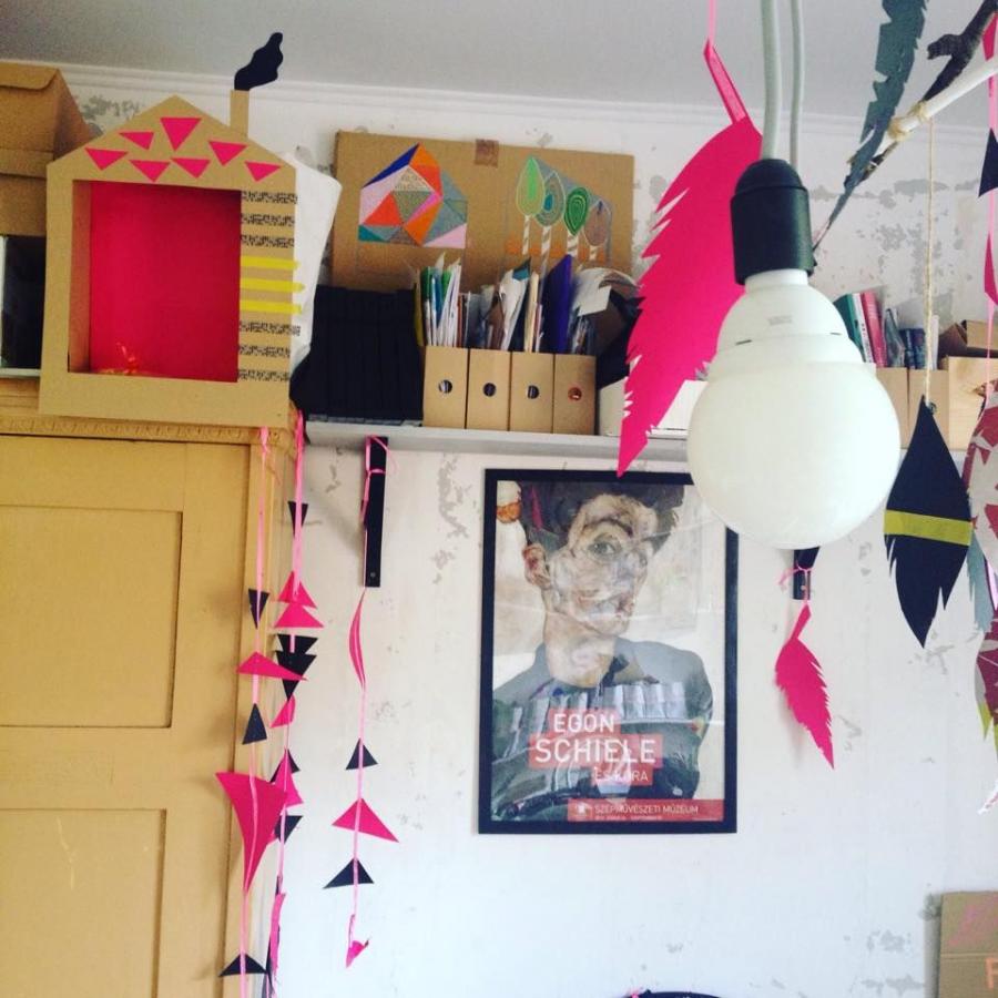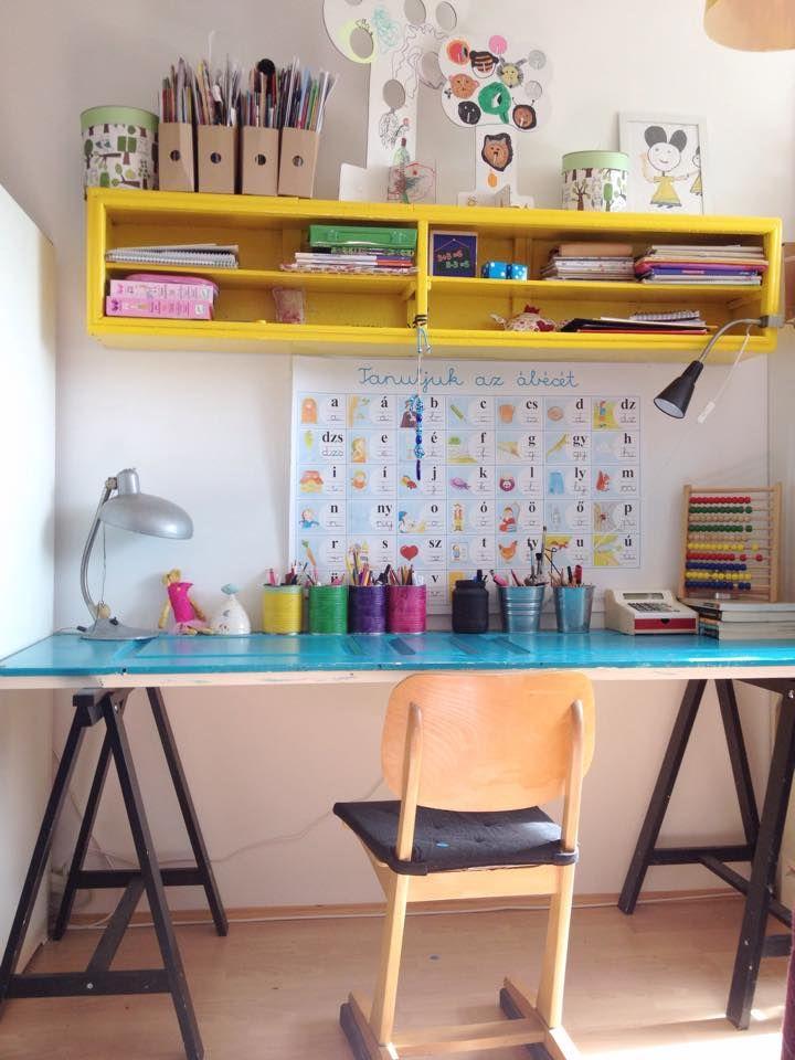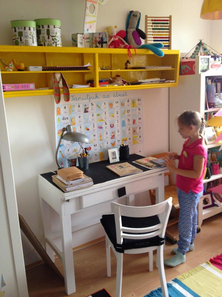 Nálunk semmi nem az aminek látszik. Az ajtó az asztal, az íróasztal pedig a konyhasziget. Úgy kezdődött, hogy egy évvel ezelőtt, amikor Boróka kezdte az iskolát egy régi nyaralóból megmentett asztalt felújítottam neki, hozzá egy sárga fali polccal. Idén viszont már ez kicsinek bizonyult mindkét gyereknek. Az én vágyam pedig már régóta egy konyhasziget volt. Így aztán két bakra tettem egy türkizre festett ajtót, ez lett az íróasztal és a fehér asztal lekerült a konyhába. Mivel nálunk még nem sok házi feladatot hoz haza a lányom az iskolából, nem sokat kell íróasztal mellett töltenünk. Legtöbbször valami alkotó feladatot kapnak, amit az én műhelyemben valósítunk meg, úgyhogy mondhatom, hogy nálunk itt van a tanuló bázis a konyhaasztal helyett. Szeretünk közösen alkotni és itt van hely a nagy aszalon.