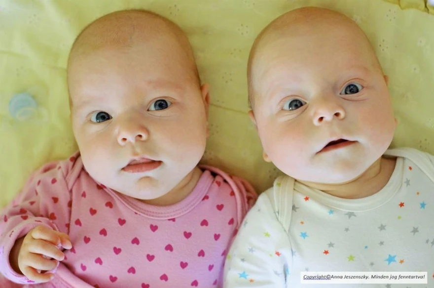 A harmadik hónapra ő is egyre több időt töltött ébren, elkezdett figyelni a környezetére. Kisebb szívrohamot okozott szüleinek, amikor két hónapos kora környékén olyan mélyen elaludt, hogy alig tudtuk felébreszteni, és bizony egy óvatos kis pofont kellett neki adni, hogy magához térjen. Olyan gyorsan még sosem tettem le az egyik gyermeket, hogy a kezembe vegyem a másikat.