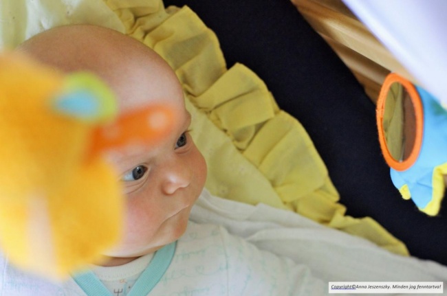 A korábban csak tétlenül csüngő mütyürök végre értelmet nyertek, a gondos, harmonikusan elosztott elhelyezésük pedig új feladatot adott nekem. A kezük használatának felfedezése komoly koncentrációt igényel, és rendkívül fárasztó művelet. A legnehezebb betájolni, hogy pontosan hol is van az a színes valami, és ahhoz képest merre megy a kis kéz, kicsit lejjebb, na, még egy picit, aztán enyhén jobbra, és meg is van! Mindezt persze, mintha egy lassított felvétel forogna.