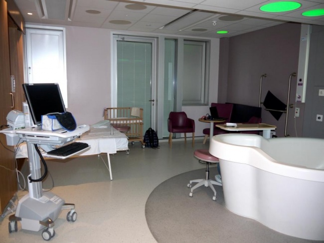 A szülőszoba, amit megnéztünk és ahol a konzultációt tartotta a szülésznő, óriási volt! A legfeltűnőbb a hatalmas kád! A kád fölött beépített hangulatvilágítás, változtatható színekkel. Nagy franciaágy, a fejrésznél kapaszkodóval. A sarokban fotelek, asztal. Az ablakokon és mellette az ajtón redőnyök, hogy teljesen sötétet, meghitt hangulatot lehessen bent csinálni. Az ajtón keresztül ki lehet menni a belső kertre sétálni, vajúdni. A szobához saját zuhanyzós fürdőszoba tartozik. A zuhanynál lehajtható szék (szédülés esetén jól jöhet). Felfújt labda. Babaöböl, amit a franciaágy mellé oda lehet rakni, ha nem akarja épp az ágyban maga mellett hagyni a kis újszülöttet az anyuka. Mert a szülés utáni 3-6 órás megfigyelés alatt is itt maradnak a szülők a babával összebújva, próbálgatva az első szoptatást. Persze, csak ezt az egy szülőszobát láttam, de a földszinten lévők állítólag mind ilyenek. Talán 5-6 szoba lehetett. Az emeleten is vannak további szülőszobák, ott csak egy kádas szoba van. A műtő részlegen sem jártunk, de a szülőszobák folyosója oda torkollik. Szükség esetén egy perc alatt elérhető.