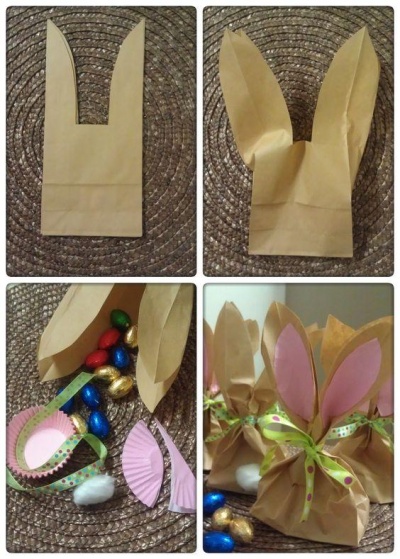Néhány nyisszantással el is készülhetünk ezzel a látványos csomaggolással. Egy egyszerű papírtasak kell csak hozzá, amit az alább látható formában vágj ki, ragasz rá a rózsaszín papírt, hogy még hangsúlyosabbak legyenek a fülek, és már kész is a húsvéti csomagolás!