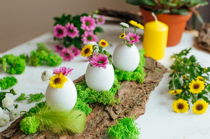 Az egyik legszebb és legegyszerűbb dísz, ha kifújsz néhány tojást, a tetejüket óvatosan feltöröd, és apró virágokkal díszíted. Ha szeretnéd, hogy tartós maradjon, akkor művirágokat használj!