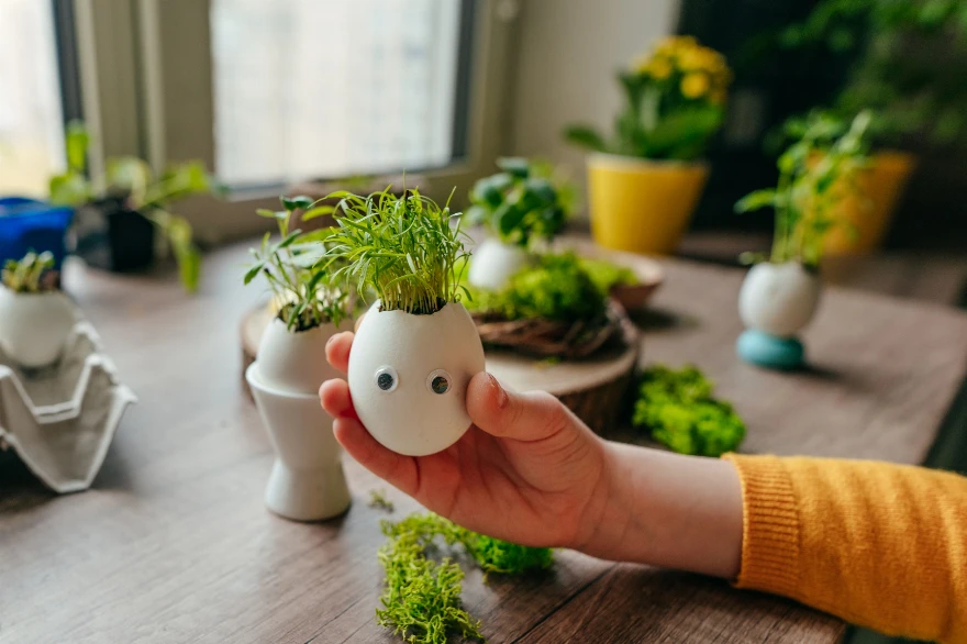 A technika ugyanaz, mint az előző esetben, de itt nem miniatűr kaspóként fognak funkcionálni a tojáshéjak. Akár már meglévő csírákat is tehetsz a tojáshéjakba, de ha nincs, akkor apró virágokból, növényekből is tökéletes frizurát alakíthatsz ki a tojásfejeknek. A szemeket meg is rajzolhatják a kicsik, vagy ragaszthattok is rájuk.