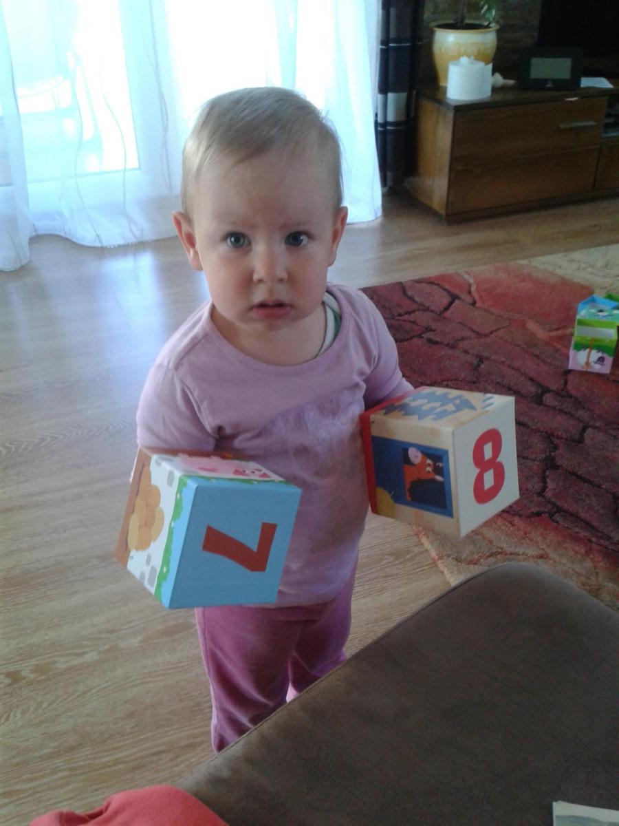 A kockák egymásba helyezése is könnyedén ment a kis tesztelőmnek, de a további lehetőségeket nekem kellett megmutatni. Viszont nagyon élvezte a szép színes állatos képeket, és a kockákon lévő számok is hasznosak voltak. Minden kockán van egy szám, különböző színekkel – ami szintén klassz dolog a tanuláshoz. A számokhoz egy-egy megszámlálható tárgy illik, ami pedig a kockán lévő állathoz kapcsolódik. (Például a kannához a tehén.) Az állatokat könnyedén felismerte és meg is tudta nevezni, és ez nagyon tetszett neki. Másnap már magától nem kereste a kockákat, de amikor újból elővettem örömmel állt neki tornyot építeni.