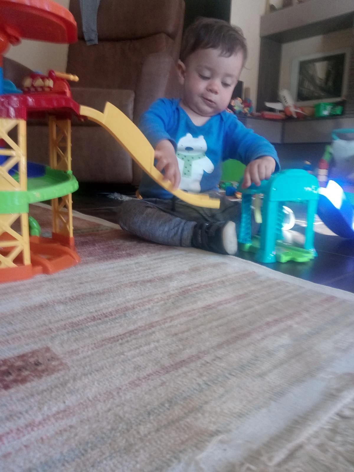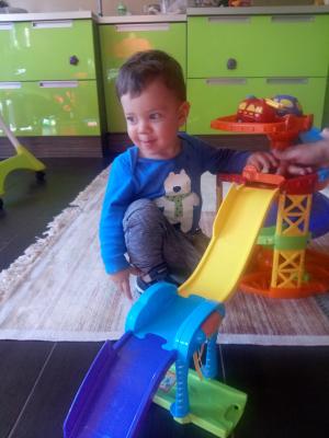 Már akkor alig bírt magával, amikor megpillantotta a hatalmas, színes dobozt. Alig hagyta kibontani a terméket, izgalmában majd’ fellökött, hadonászott, visongatott, jelezve „gyorsabban már, gyorsabban már, játszani akarok!” A különálló kisautókkal kezdtük; a tűzoltóautó, amint kézbe vette, jópofa hangokat adott ki, és kisöcsém szeme azonnal felcsillant, a füléhez emelte, úgy hallgatta percekig. Végül a pálya doboztalanítása következett, amit Milán önmagában is nagyon érdekesnek talált: sok színes, különböző formájú elem, és még egy meg még egy, meg még egy. Nem engedte, hogy én szedjem ki a dobozból, ő akarta ellenőrizni, „minden megvan-e” – persze megvolt hiánytalanul, mindkettőnk nagy megelégedésére.