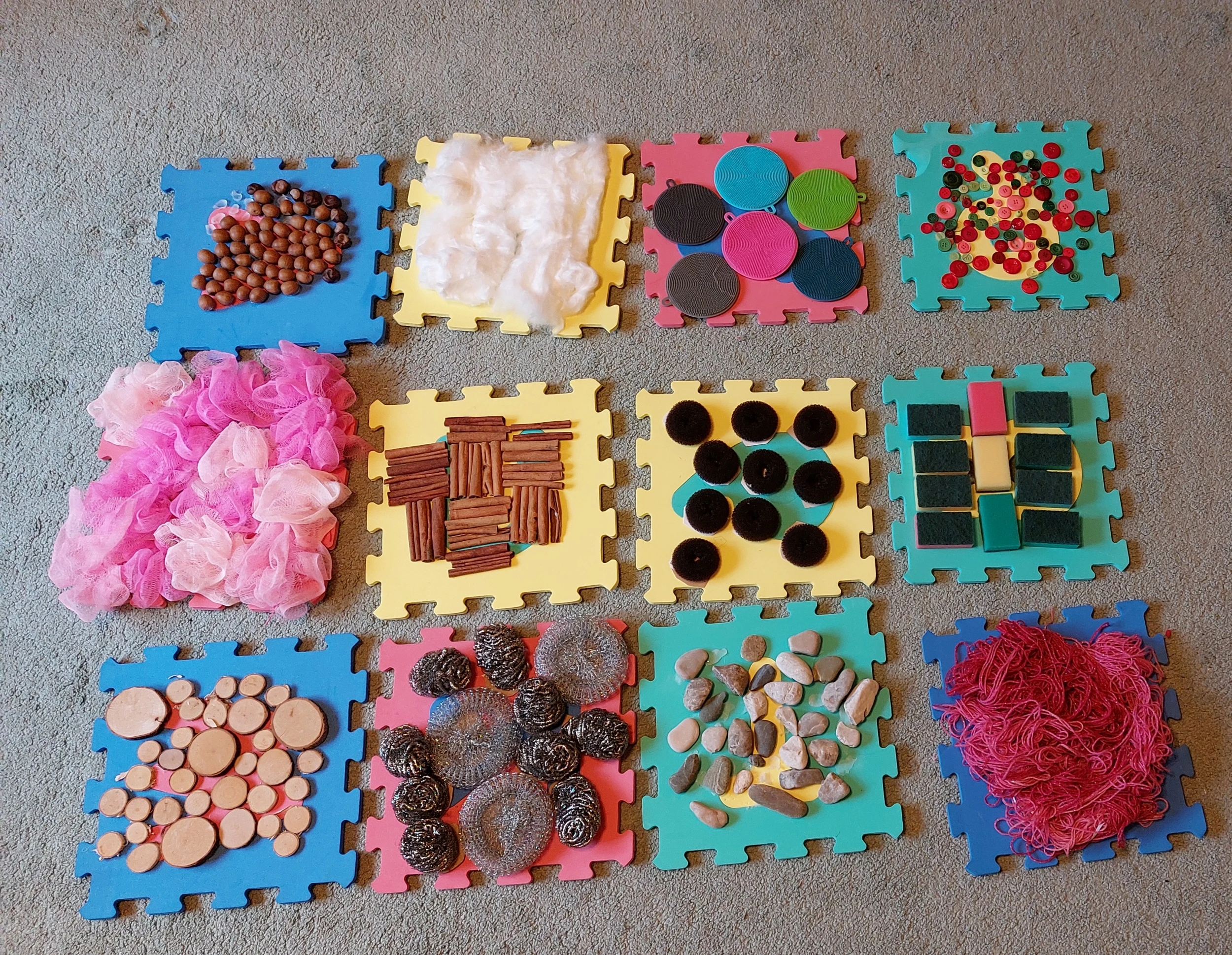 Elmesélem az én példámon, mire is gondolok. Nagyon szerettem volna egy szenzoros szőnyeget vásárolni, amin sétálhatunk különböző érzeteket megtapasztalva. Kerestem minden oldalon, de egyszerűen nem sikerült olyat találnom, ami számomra ár-érték arányban megérné. Már majdnem feladtam, amikor rájöttem, ezek csak műanyag darabok, amelyek vagy emlékeztetnek arra, ami rajtuk van vagy nem. Tényleg nem éri meg. Így legyártottam a saját kis érzékelős szőnyegeinket.