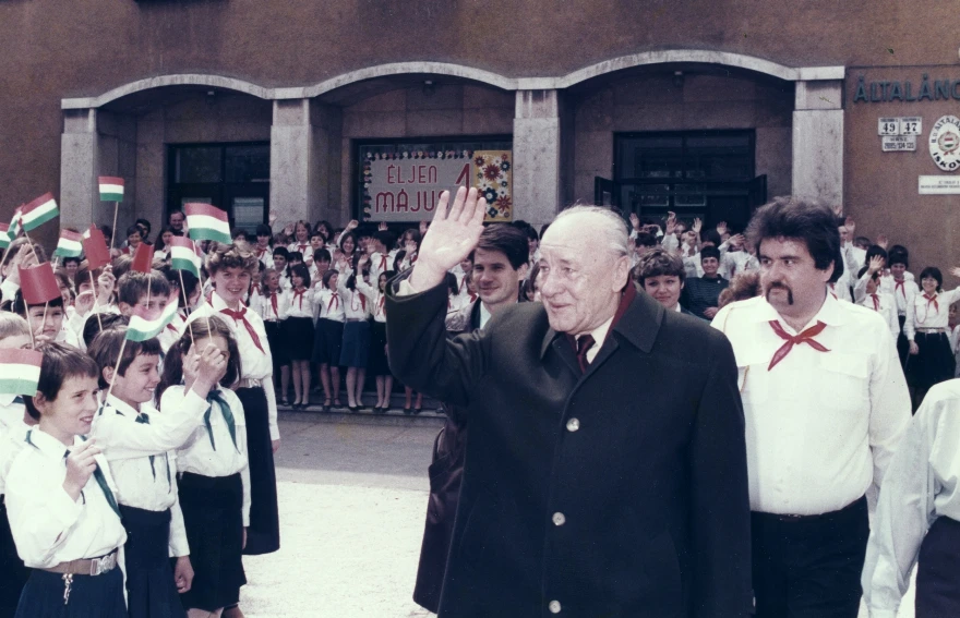 Az ünnep alkalmával Kádár János is ellátogatott egy-egy intézménybe, iskolába. A fotón a 2 sz. Általános Iskola diákjai (később Hegedűs Géza Általános Iskola) köszöntik 1985-ben. (Fotó: Fortepan, Angyalföldi Helytörténeti Gyűjtemény)