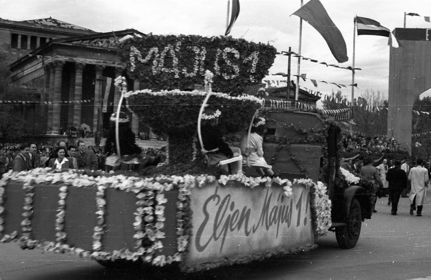 A május 1-jei felvonulásokhoz a feldíszített teherautók is hozzátartoztak. (Fotó: Fortepan, Berkó Pál, 1947)