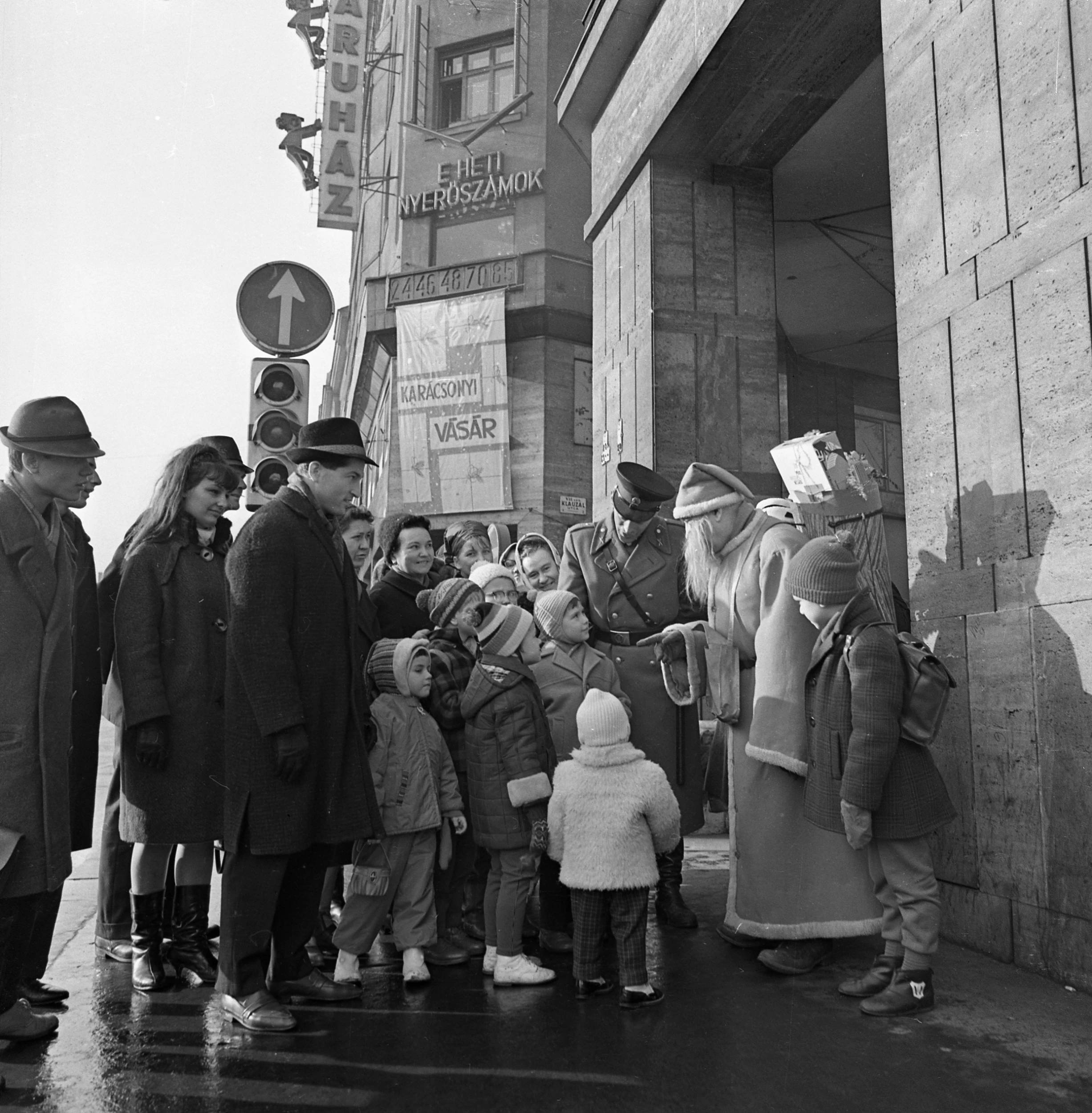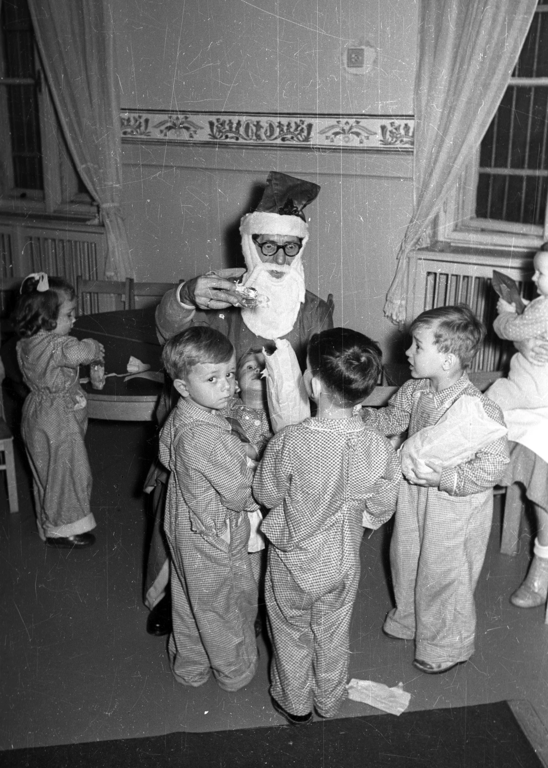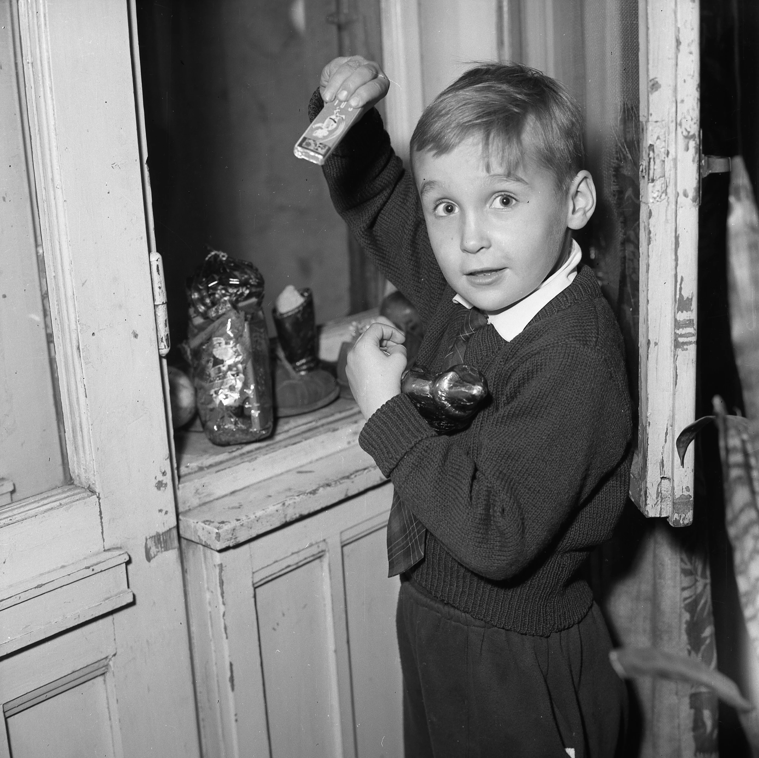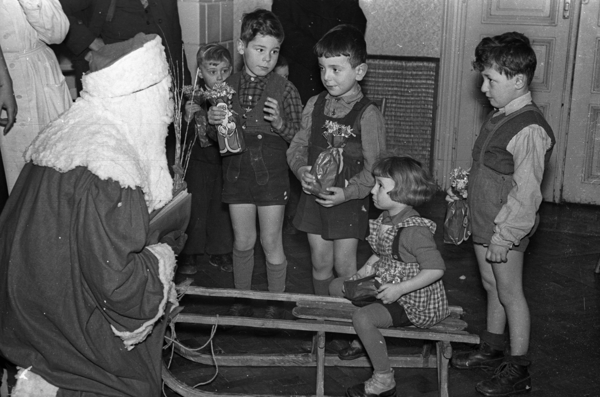 Sokan a mai napig emlékszünk a Mikulás mély, öblös hangjára, ahogy arról tudakolózott, jó gyerekek voltunk-e. Erre természetesen egyetlen helyes válasz létezett: megszeppenve bólintottunk, és vártuk, hogy a kezünkbe adja a mikuláscsomagot - pont úgy, ahogy ezen az 1958-as fotón.