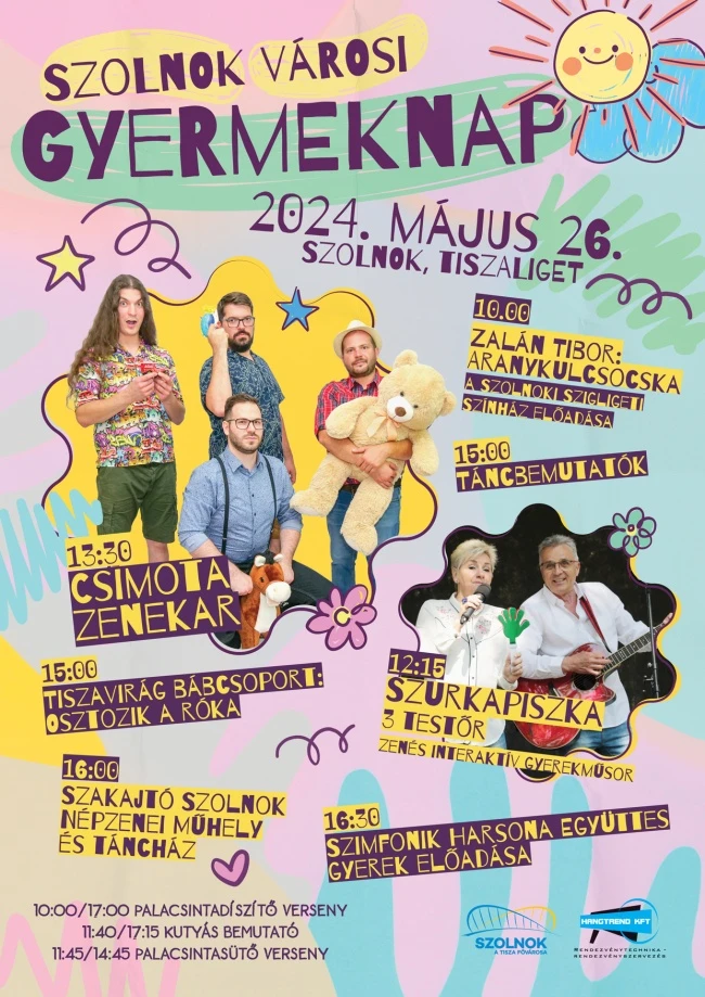 Szolnok Városi Gyermeknap 2024. május 26-án vasárnap 10 órától. Helyszín: Tiszaliget. Minden kicsit és nagyot várunk szeretettel! Lesz palacsintasütő verseny, palacsinta díszítő verseny, kutyás bemutató, színházi előadás, bábelőadás, táncbemutatók és koncertek.
