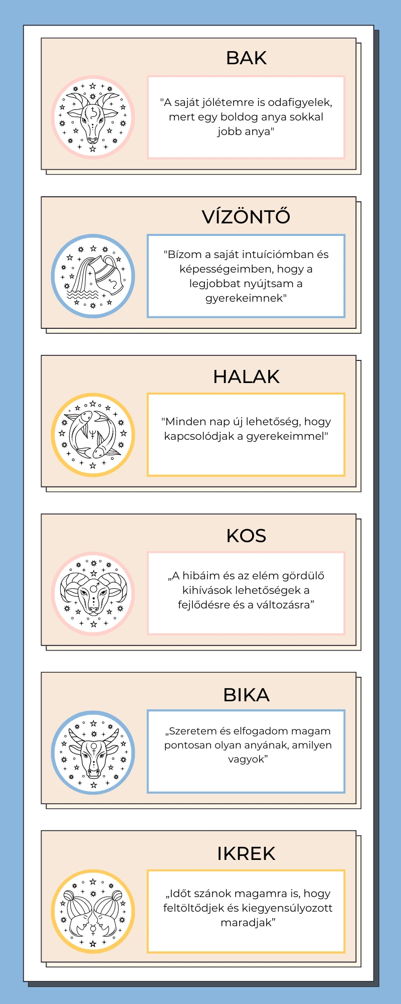 Olvasd el a legfőbb csillagjegyek alapján összeállított Anya-mantra listánkat, ismételd el magadnak a tiédet hangosan háromszor, írd ki egy cetlire és vidd magaddal a munkahelyedre, hogy bármikor rápillanthass, ha szükséged van rá; vagy akár írd fel a tükörre, ha úgy látod, azzal könnyebben magadénak érezheted a leírt sorokat!