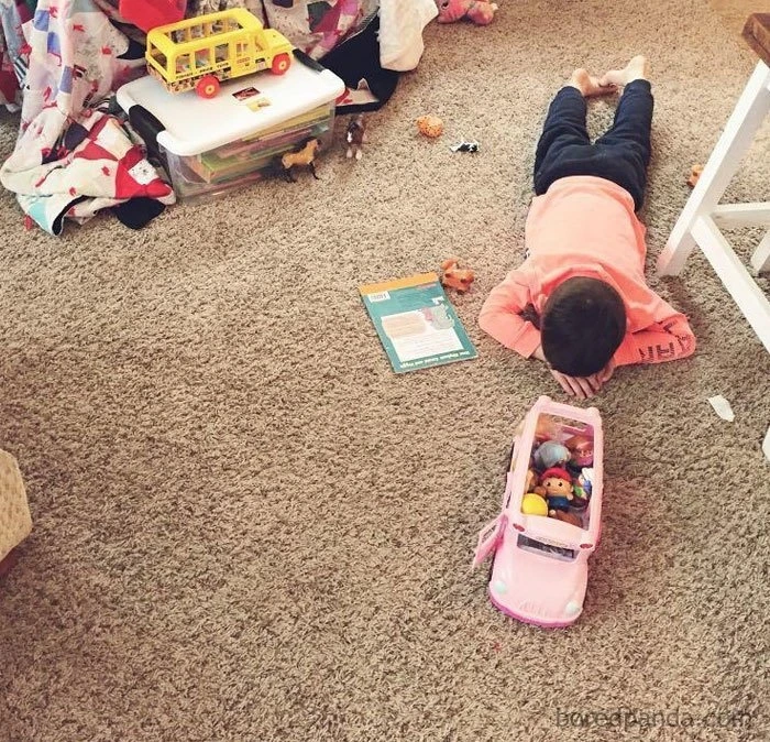 Következő szemünk fénye 20 percig azért ordított, mert a rózsaszínű busz kellett neki, majd miután megkapta, közölte, hogy nem szereti a rózsaszínt.