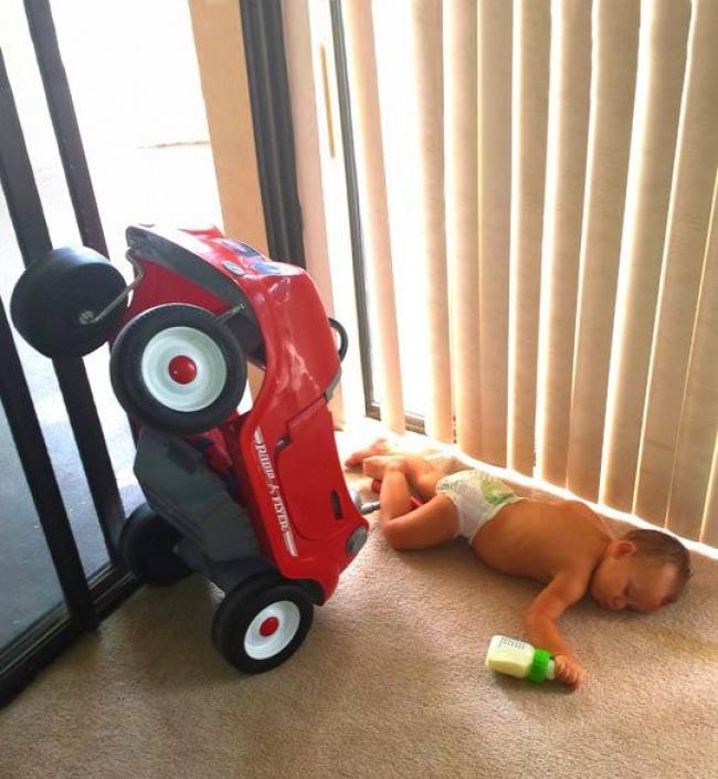 A fiam az új játékautójával körbe-körbe vezettet a szobában, közben tejet ivott. Majd nem sokkal később így találtam rá...