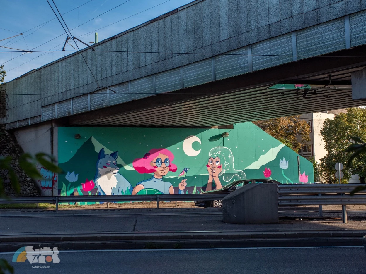 A közlemény emlékeztetett, hogy csaknem 60 pályamű érkezett a felhívásra. A Szerémi út 2. alatti falfestmény Bakos Zsuzsi grafikus, street art művész vezetésével 5 nap alatt készült el, a munkához 70 liter festéket használtak fel. A híd szemközti, Szerémi út 1. szám alatti másik pillérének megfestése Váczy Enikő vizuális alkotó nevéhez fűződik. Ennek kivitelezéséhez 67 liter festéket használtak fel 8 nap alatt - áll a közleményben.