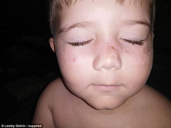 Lesley Galvin, Ipswich városából (Queensland) szülőtárs szintén arról számolt be, kisfia, Alexander bőre „a húsáig leégett”. A fotón a kis Alexander látható négy nappal a napégés után - ő szintén ugyanezzel a naptejjel volt bekenve. (Fotó)