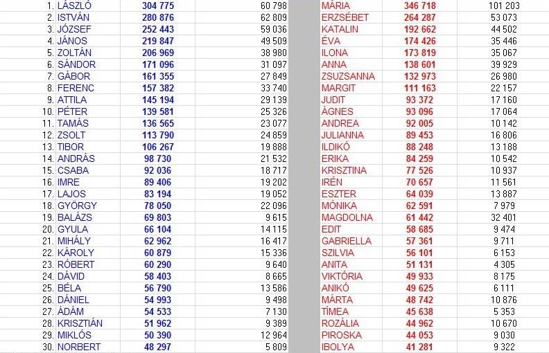 Ma a női nevek közül a teljes hazai lakosságot tekintve a leggyakoribb ugyan a Mária, az Erzsébet, az Éva és az Ilona (ebben a sorrendben), a férfiaknál pedig a László, István, József, János, István, a ma legdivatosabb keresztnevek között nem találjátok.
