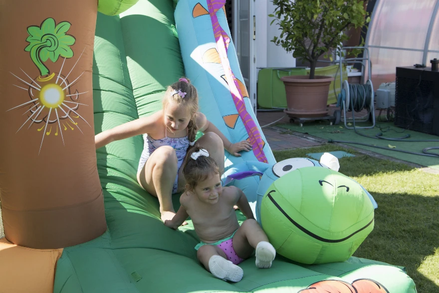 A fürdésben a meleg idő miatt megszomjaztak, így egy kép erejéig a felfújható pohártartókat is felavatták a medencében, melynek nagy sikere volt. A két kislány gyorsan összebarátkozott a Panzióban megszálló és a játékba bekapcsolódó gyerekekkel, így a felnőttek kicsit kimentek beszélgetni, később pedig pizzát rendelni a Port Étteremből, ahonnan házhoz vitték az ebédet. Miután megebédeltek visszatértek fürdeni, kis idő elteltével pedig arra lettek figyelmesek, hogy az ugrálóvár is felállításra került. A gyerekek, amint meglátták a várat, ugrottak ki a vízből és birtokba vették a játékot. Miután kiugrálták, csúszkálták magukat, felfedezték az ugrálóvár mellett lévő homokozót és trambulint is, ahonnan igencsak nehéz volt őket elcsalogatni.