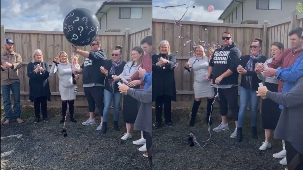 A férfi kezében ugyanis egy héliumos fekete lufi, amelybe konfetti és további kis lufik vannak. Ezek színe adja meg a választ a gyerek nemére, ha kék, fiú, ha rózsaszín, lány.