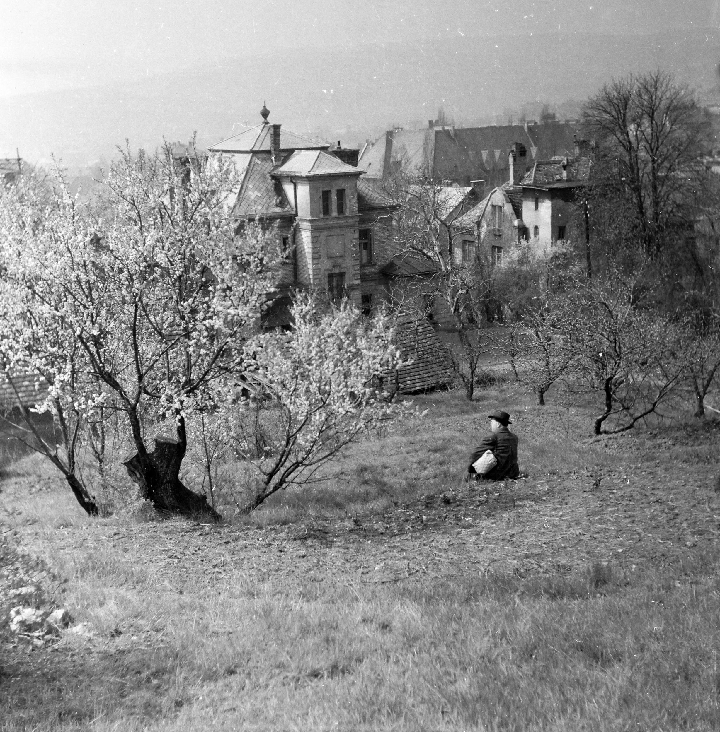 Egy évvel később, 1955-ben járunk, újra Budán: a Mandula utca egyik telkéről a Bolyai utca 11. és 13-mas számú ház felé néz az éppen megpihenő kalapos úr. Háttérben az Áldás utcai Álltalános Iskola tetőzete látható.