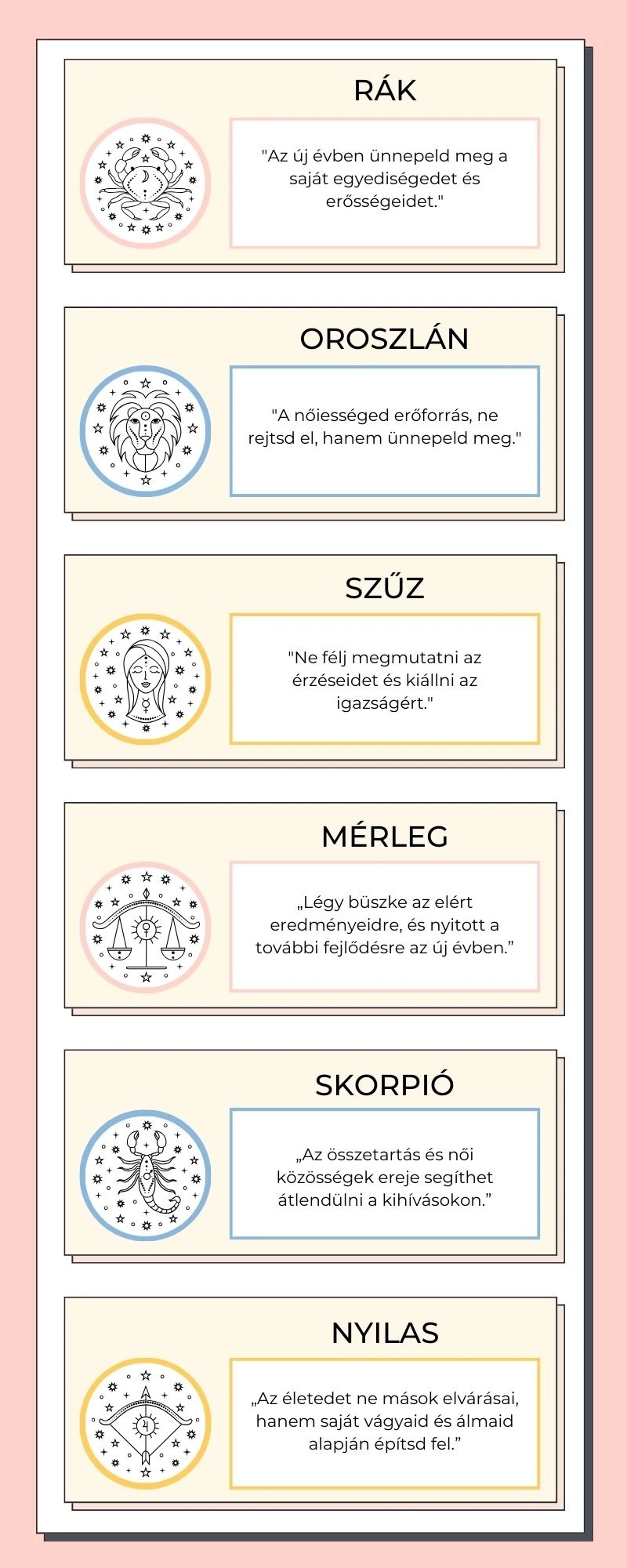 Sokan úgy tartják, az asztrológia is inkább önismeret, mintsem csillagokból számított jóslat. Így hát, ha nem is hiszünk el mindent a horoszkópunknak, annyit azért talán mindannyian megengedhetünk magunknak, hogy a születésünkkor épp az eget uraló bolygóknak tulajdonított legfőbb személyiségjegyeink mentén, igyekszünk nap mint nap a legtöbbet kihozni egyszeri és megismételhetetlen életünkből.