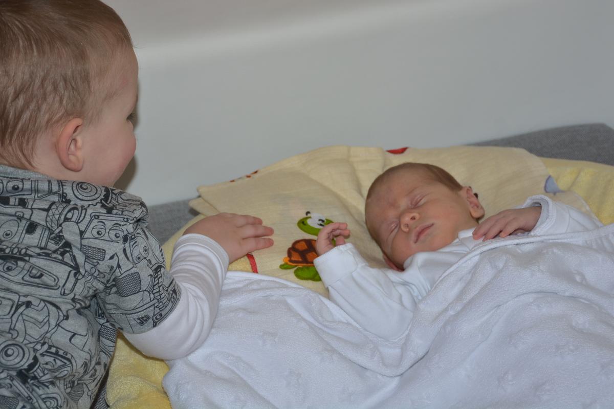 Az első napon a Babóca (sokszor így hívom őt) még szinte csak aludt, nyilván kifárasztotta az út erre a világra. Nem is volt gond, lehettünk mindannyian egy szobában. De ha a kicsi csak megmoccant, a nagy máris sírni kezdett. Ez a szituáció éjjelre csak fokozódott, ha a Babóca nyöszörögni kezdett, a fiam máris sírt, hogy vigyük ki a babát a szobából. Előző éjszaka egyikünk sem aludt sokat, így hajnalra az apja átköltözött a gyerkőccel a nappaliba, én meg maradtam a babával a hálószobában. Nem volt sírós baba, inkább csak nyöszörgött, én meg máris cicire raktam, de a fiam még másnap is csak tisztes távolságból volt hajlandó figyelni a picit. A második éjszaka szintén hasonlóan telt, annyi volt csupán a változás, hogy már nem vitte ki az apja a gyerkőcöt, hanem folyamatosan magyaráztuk neki, hogy a pici szereti őt, és ezután mindig velünk lesz, nem visszük ki a szobából. Minden egyes szoptatásnál és vércukormérésnél lefutottuk ezt a kört. Sokat nem aludtunk ugyan, de a harmadik napra megtört a jég. Még mindig gyakran elhangzott az „Anyu kiviszi a babát” mondat, így sugallva, hogy menjek a picivel a másik szobába, de a magyarázatot, miért nem viszem ki a babát, már nem követte sírás. A nagyedik napon már megvolt az első érintés is a tesók közt, persze csak egy fél másodpercre és csak egy ujjal :) , de nekünk, szülőknek már ez is sokat számított.