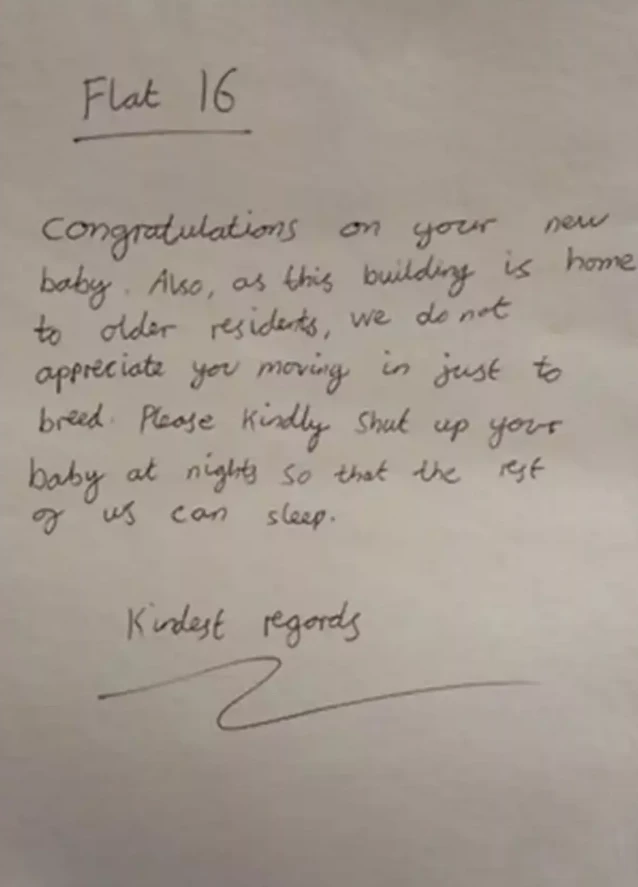 Gratulálunk az újszülötthöz! Ugyanakkor ebben az épületben idősebb emberek élnek, és nem értékeljük azt, hogy csak amiatt költözött be, hogy gyerekeket szüljön. (a levél valójában ennél durvábban fogalmaz, ugyanis a „szaporodás” szót használja – a szerk.) Kérjük szépen, hallgattassa el a babáját éjszaka, hogy mi, többiek aludhassunk! Szívélyes üdvözlettel!