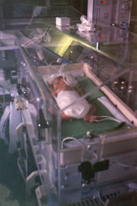 Én tehetetlen voltam, csak feküdtem kábán, nem lehettem vele, még mindig életveszélyben voltam. Két nap múlva lettem olyan állapotban, hogy tolókocsival vittek át a koraszülött-részlegre, hogy végre megláthassam Őt. Sohasem felejtem el az első találkozást! Ott feküdt csendesen az inkubátorban. Alig látszott ki a sok műszer, infúzió, rácsatolt érzékelők és drótok közül. Vékony kis karjában-lábában tűk voltak, amit fogalmam sincs, hogy tudtak behelyezni az ujjnyi kis végtagjaiba, szörnyű volt látni, ahogy küzdött a leheletnyi kis életéért, de én mindvégig vele voltam és bíztattam, most nagyon erősnek kellett lennem.