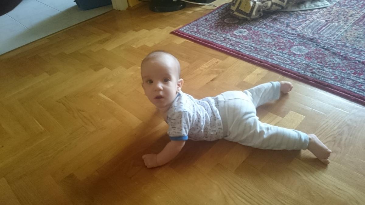 Mint minden héten, most is utánanéztünk, mi minden jellemző ilyenkor egy babára. Már egy ideje gyanakszunk, hogy igazából ezt a naplót írják át általánosra, mert pöccre azokat tudja Mimzer, amiket kell ebben a korban. Ilyen például a mászás. Hetek óta próbálgatja, hogyan lehet eljutni egyik pontból a másikba, de túl sokat eddig nem haladt. Vagy ha igen, akkor is csak hátrafelé. Most, az egyik nap fogta magát, és – már irányhelyesen, azaz előre – átslisszolt a szoba egyik végéből a másikba. Többször is, mert hiába vittem vissza a kiindulópontra, csak ment előre újra és újra. Már az ágyunkban sem merjük csak úgy otthagyni, mert amilyen kis furfangos, képes leesni róla. Ezért egy ideje komoly védelmi vonalakat fejlesztgetünk párnákból és takarókból. Emlékszem, ez működött a húgomnál is egy ideig, de aztán ő is megállíthatatlan volt.