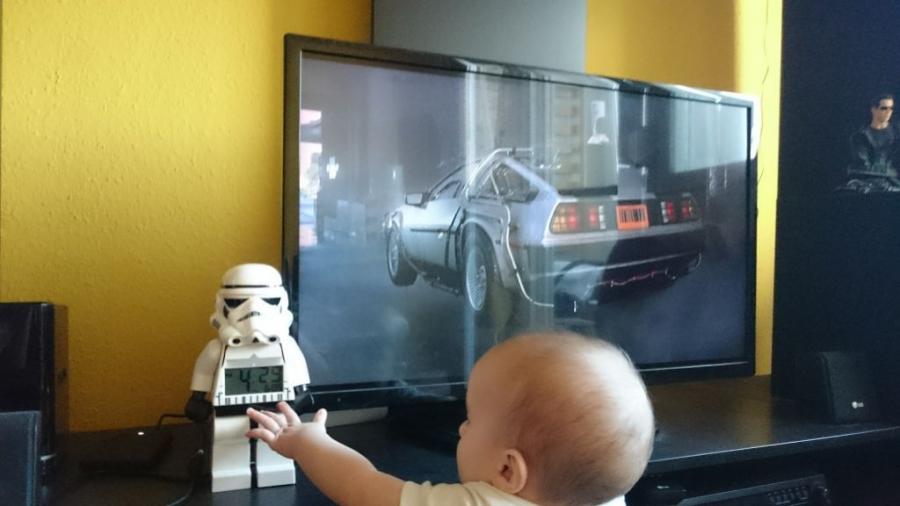 Történelmi pillanatnak is részese volt Baba úr a héten, hiszen kölyökkorom egyik kultikus filmje, a Vissza a jövőbe most teljesedett be. A történet szerint ugyanis éppen ezen a szerdán, 2015. október 21-én, 16:29-kor érkeznek meg McFly-ék a jövőbeli Hill Valley-be. Ezt a jelenetet Mimó pont akkor látta is, ami így olyan volt, mintha élőben nézte volna a landolást. Most még nem értékeli ezt, de majd kamaszként nagyon fog örülni, hogy a papija dokumentálta ezt a fontos pillanatot. Vagy nem, de én akkor is örülök, hogy sikerült. Volt, aki szerint az időeltolódást nem vettem számításba, hiszen közép-európai idő szerint mindez csak a következő nap hajnalban volt aktuális nálunk. Erre az a válaszom, hogy egy időutazós filmben, egy fiktív város időzónája igazából tökmindegy.
