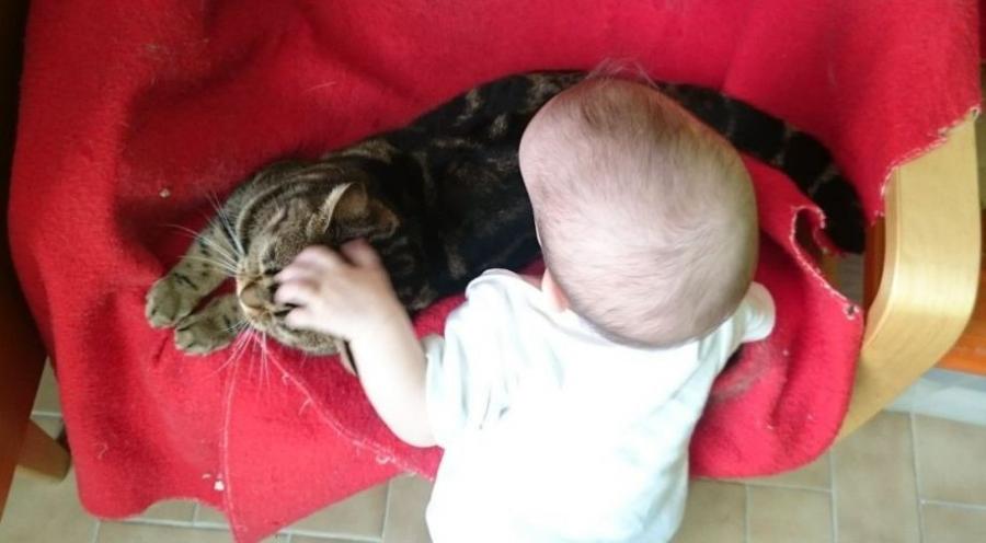 Mindemellett feltűnően barátkozó típus a kisfiam. Ha jön hozzánk valaki, rövid méregetés után mindenkivel pajtizik. Ez nagyon fontos, mert talán nem kopik el ez a tulajdonsága, mire felnő. Egyelőre Pizsi a legkomolyabb haverja, aki láthatóan egyre közelebb engedi magához. Sőt, már nem csak nem menekül el, de hagyja, hogy Mimzi gyömöszkélje, rángassa, markolássza, és ami a legfontosabb: simogassa.