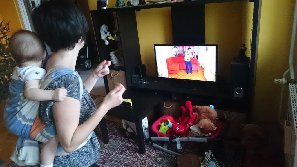 Az ünnepekre tekintettel Viru Maminbaba órái szünetelnek, mert téli álmot alszik az edzőterem. Ennek kicsit örülök, mert így láthattam végre, mi is ez az egész. A szünet alatt ugyanis otthon nyomja az edzéseket, az internetről letöltött edzővel. Most értettem meg, hogy a tévétorna, amit mindig valami kényszeres túlbuzgóságnak gondoltam, társadalmilag mennyire hasznos műsor volt. Azt pedig nagyon érdekes volt látni, hogy Mimzi a második szám végére simán bealudt. Mindig elmondja Virág, hogy a tornateremben ez van, és úgy látszik, ezt itthon is zokszó nélkül produkálja a mamája hátán.
