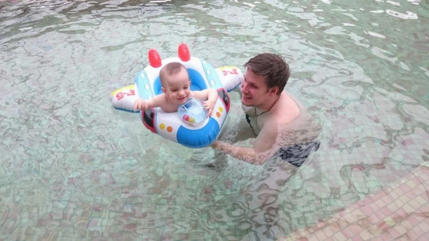 Most ez annyiban módosult, hogy az ott készült gyereket akartuk boldoggá tenni. Ez sikerült is. Mimzi napokon keresztül folyamatosan nevetett, a vizet meg nagyon élvezte. Azt nem tudjuk, hogy akkor mi lett volna, ha amúgy nem járna három hónapos kora óta babaúszni, de gyanús, hogy legalábbis az elején sokkal jobban meg lett volna szeppenve. Ehelyett imádta a menő, szülinapjára kapott, de csak most átadott repülőgép-úszógumiját, meg a pancsolást.