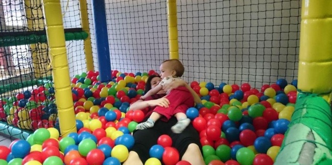A játszóház sarkában voltak a golyók. Ide én nem fértem volna be, de Viru szívesen bement, mert régóta szerette volna kipróbálni. Olyan volt, mint egy nagyra nőtt kicsi lány, akinek régi álma teljesül. Imádtam nézni, ahogy ketten fetrengtek a színes gömbök között.