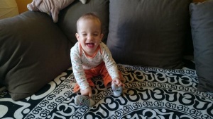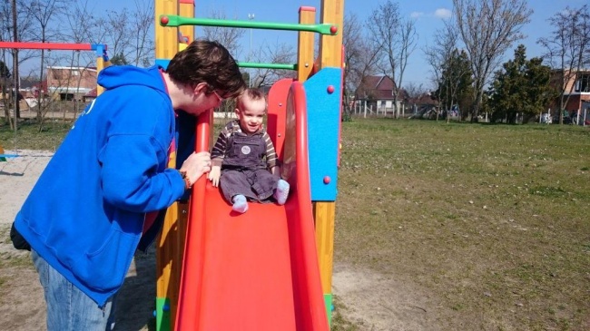 A héten voltak nagy kalandok is. Például az első komoly játszóterezés rugós dínóhintával és csúszdával. Végiggondoltuk persze, hogy mi lesz, ha nem örül majd Baba úr, de nyilván megint tévedtünk. Az imbolygó őshüllő is tetszett neki, a csúszdát pedig egyenes imádta. Egy dolgot bánok, hogy a malám elveszett a parkban, amikor odaadtam Mimmernek, mert annyira szereti. Én voltam a hülye, mert nem figyeltem eléggé, így a játszótéri fekete lik simán megette.