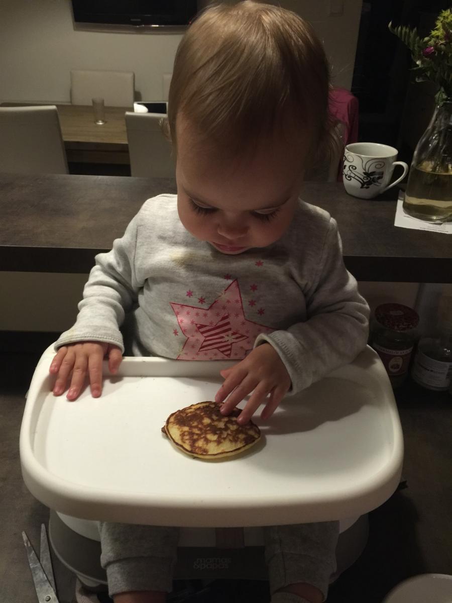A turmixgépbe dobáld bele a hozzávalókat. Készíts elő egy palacsintasütőt, amit előtte olíva olajjal kikentél. A turmixgépből öntögesd ki a palacsintatésztát a sütőbe. Elég sűrű masszát kellett, hogy kapj, így könnyen formálhatsz babakezecskékbe passzoló picike palacsintákat.
