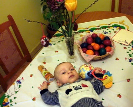 Megvolt Csongor első húsvétja! Az első Karácsonyán még csak négynapos volt és gyakorlatilag átaludta, a húsvétban már sokkal aktívabban vett részt. Nálunk ez úgy zajlik, hogy itthon már korán, pénteken vagy szombat reggel jön a nyúl, aztán elutazunk anyukámékhoz, ott meg szombat délután van ünnepelés, sonkás-tojásos vacsora, és még a vasárnapot is együtt töltjük. Ajándékot csak a gyerekek kapnak, ők is apróságokat: itthon könyvet, a nagyszülőktől-nagynéniktől egy-egy labdát, homokozó játékot, ilyesmit. Meg persze édességet, gyümölcsöt, hímes tojást.