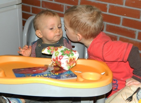 Regő minden várakozáson felüli volt: a legjobban a fának örült, nem esett neki az ajándékbontásnak, hanem leült, és egy ideig csodálta. Aztán kerestük, hogy mi az övé, mi Csongoré, Marciét félretettük, és amikor mindent kibontottunk, olyan szépen játszottak egymás mellett, hogy öröm volt nézni. Regőnek az állatos duplo készlet telitalálat volt, alig bírt tőle elszakadni, fürödni is csak úgy vihettem, ha a zebrát is magával viszi. És Csongor is szépen elvolt a kapott fajátékokkal, próbálta illesztgetni a fogantyús kirakó darabjait a helyére.